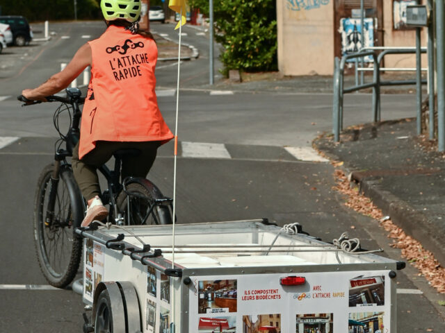 La collecte : Accompagnez Amandine, Jean-Marc, Marie, Richard ou Christophe pour leur collecte quotidienne des biodéchets ! La collecte se fait à vélo électrique avec remorque chez nos 40 établissements partenaires et 14 écoles dans le centre-ville de Bergerac et de Périgueux.